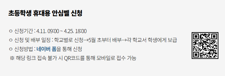 ✔ 5월부터 배급 예정이고 초 1, 2학년부터 '초등학생 휴대용 안심벨' 보급을 시작