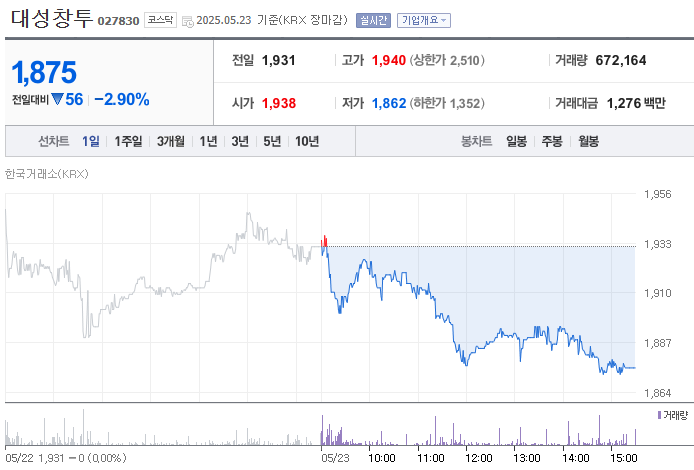 | 대성창투 | 1,875원 | -5.6% | -2.90% | 김영훈 대표, 하버드 동문 |