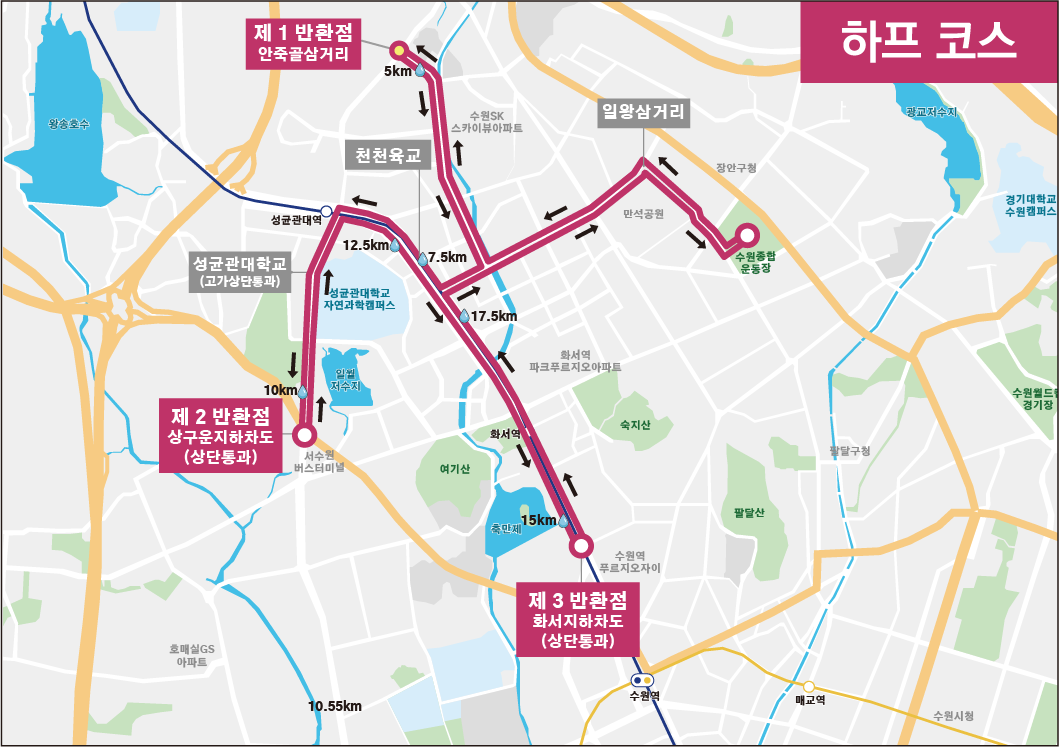 코스 설명: 풀코스의 절반 정도 거리로 편성되어 있으며, 동일 경기장에서 출발해 경로의 중간 지점에서 도착합니다.