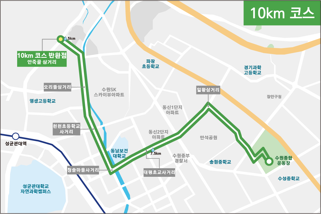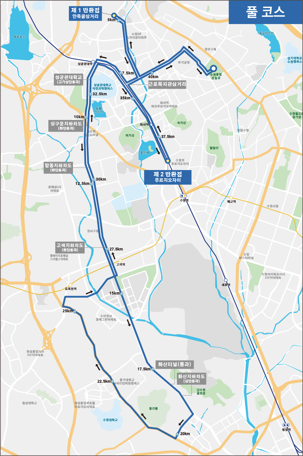 코스 설명: 정규 풀코스 코스는 수원종합운동장을 시작점으로 하여, 도심 및 인근 주요 지점을 경유하며 동일 장소로 복귀하는 루트로 구성됩니다.