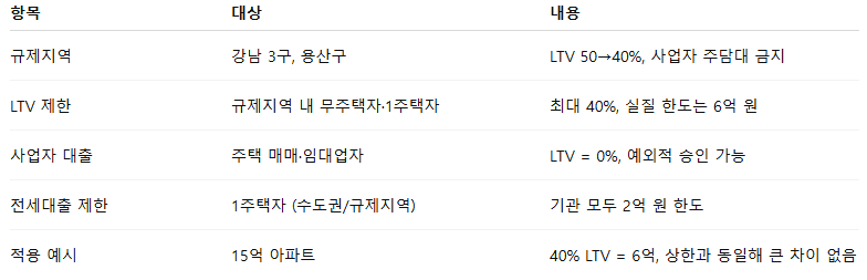 이번 발표에서 이들 지역의 주택담보대출비율(LTV) 상한이 **50% → 40%**로 강화되었죠.
